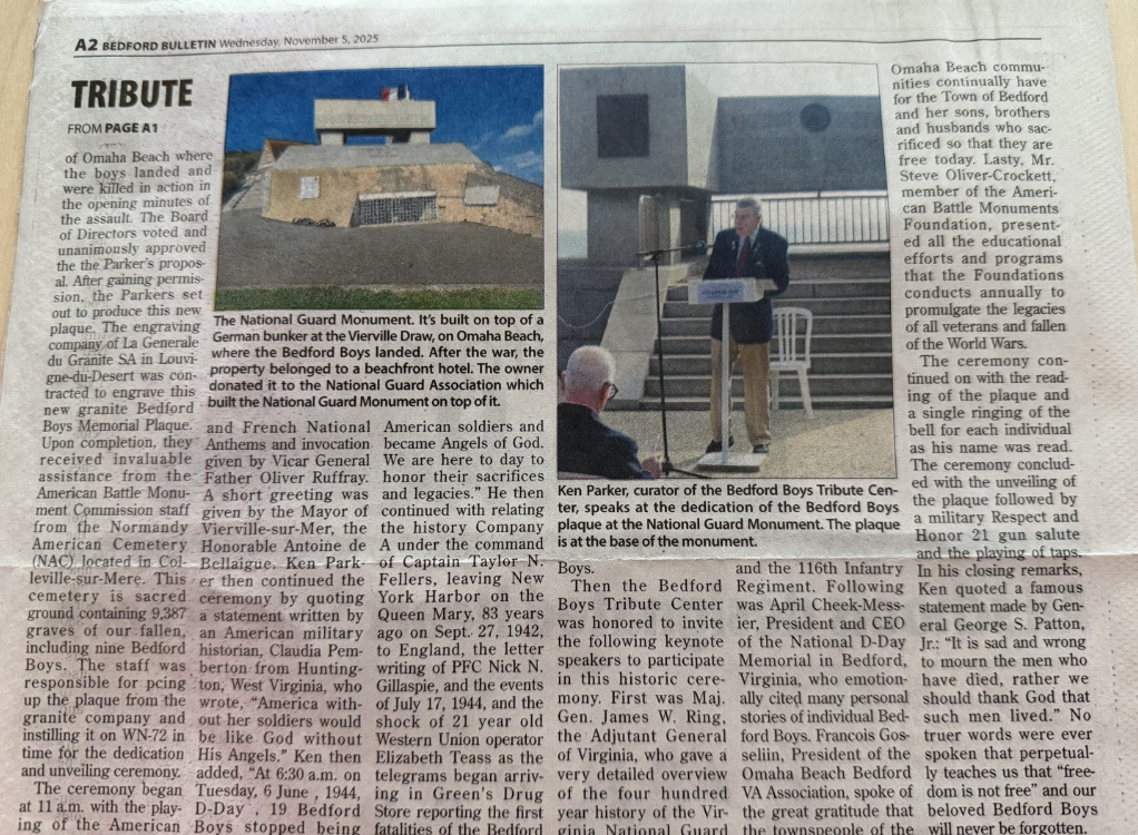 The Bedford Boys Tribute Center invited the following keynote speakers to participate in this historic ceremony: First was Maj. Gen. James W. Ring, the Adjutant General of Virginia, who gave a detailed overview of the 400-year history of the Virginia National Guard and the 116th Infantry Regiment. Following was April Cheek-Messier, President and CEO of the National D-Day Memorial in Bedford, Virginia, who emotionally cited many personal stories of individual Bedford Boys. Francois Gosselin, President of the Omaha Beach Bedford VA Association, spoke of the great gratitude that the townspeople of the…